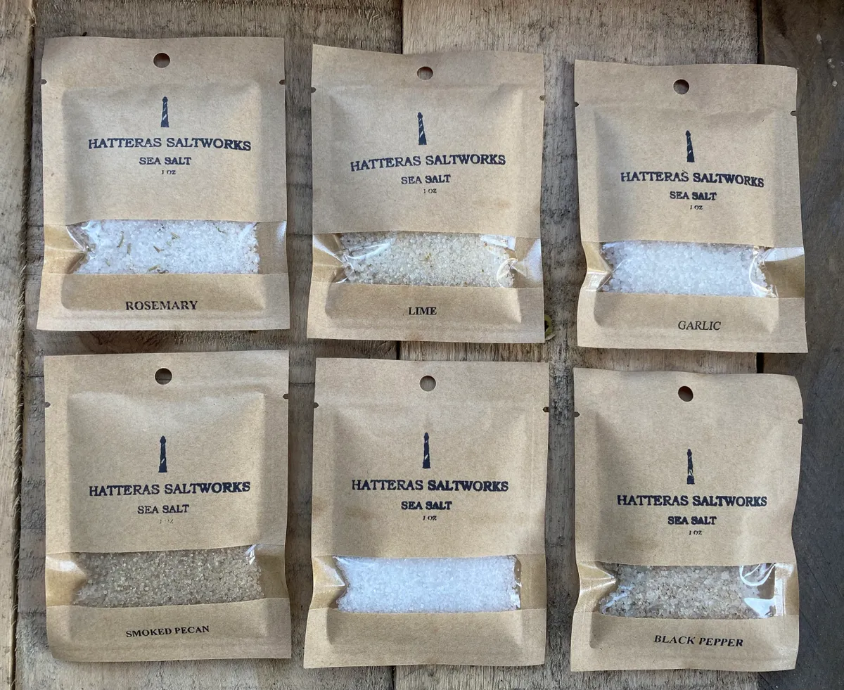 A collection of 6 of Hatteras Saltworks Sea Salts.