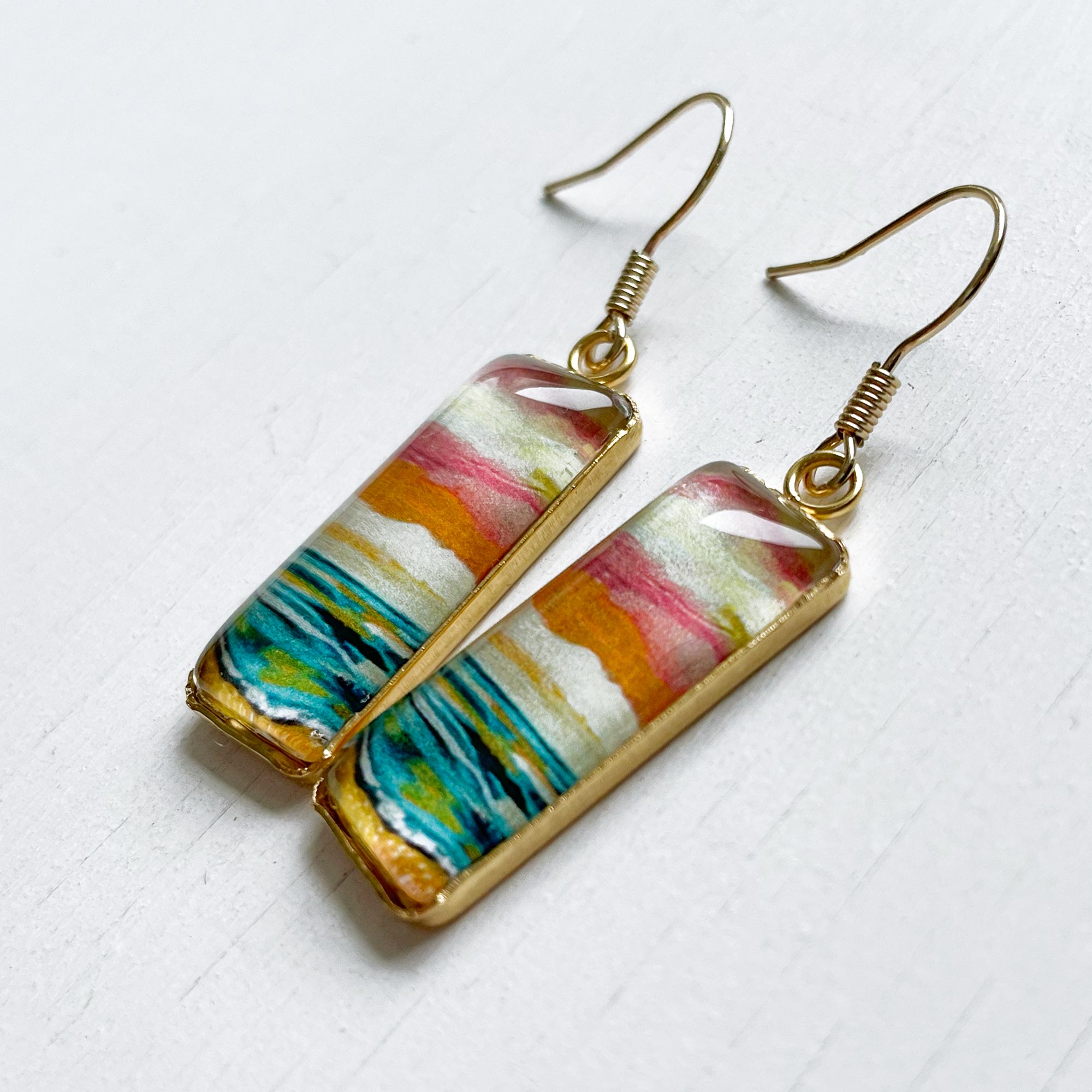 *These lightweight bar earrings feature tiny prints of my original paintings, they’re rich in color and painterly detail. They add a fun, vibrant touch to any look.