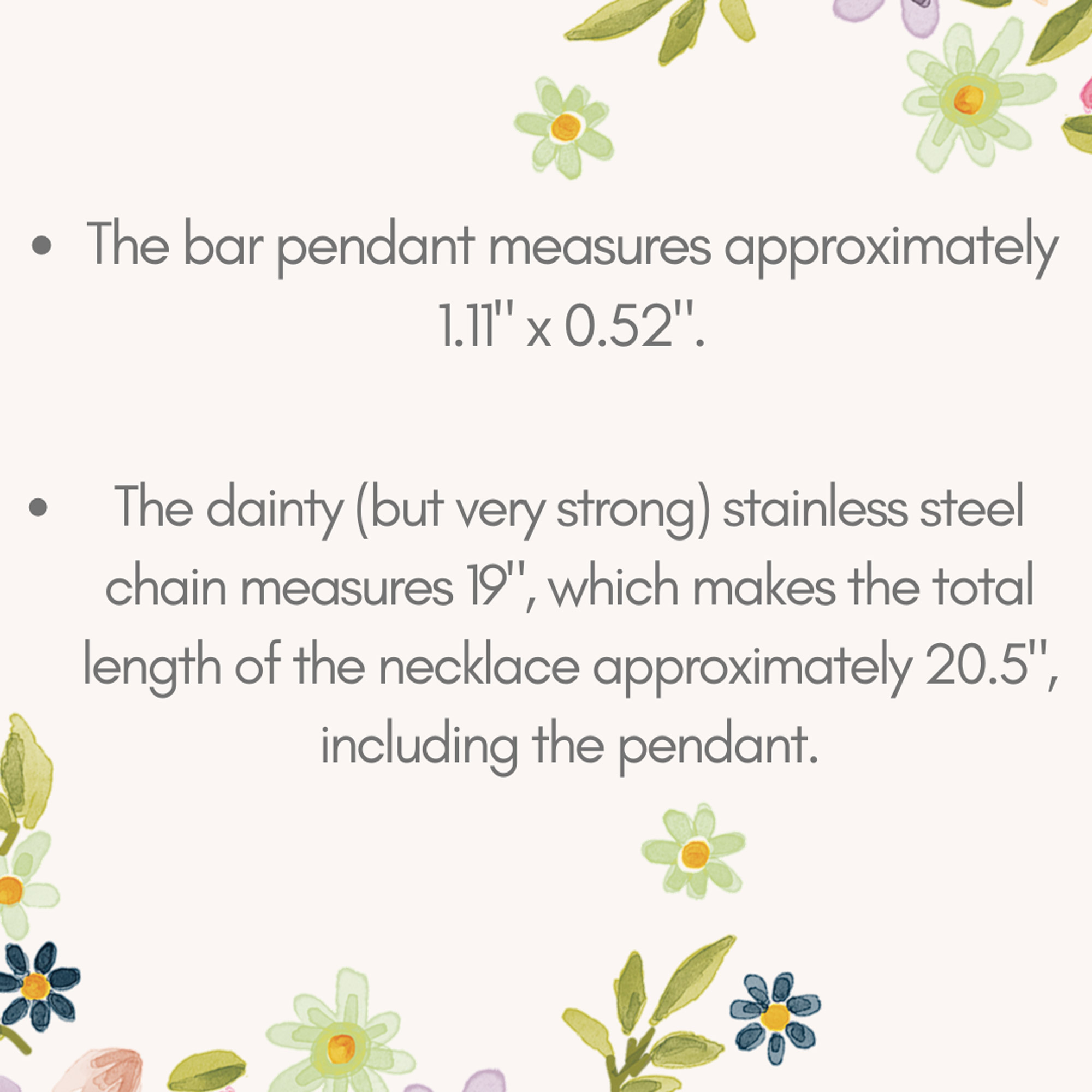 The dainty (but very strong) stainless steel chain is 19″, which makes the total length of the necklace approximately 20.5″, including the pendant.
