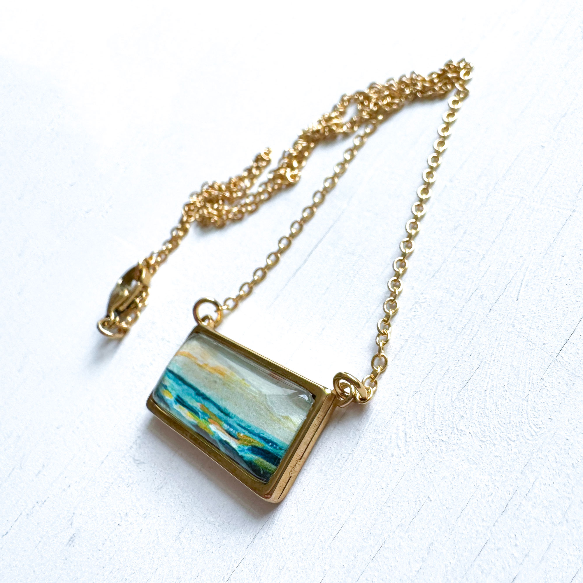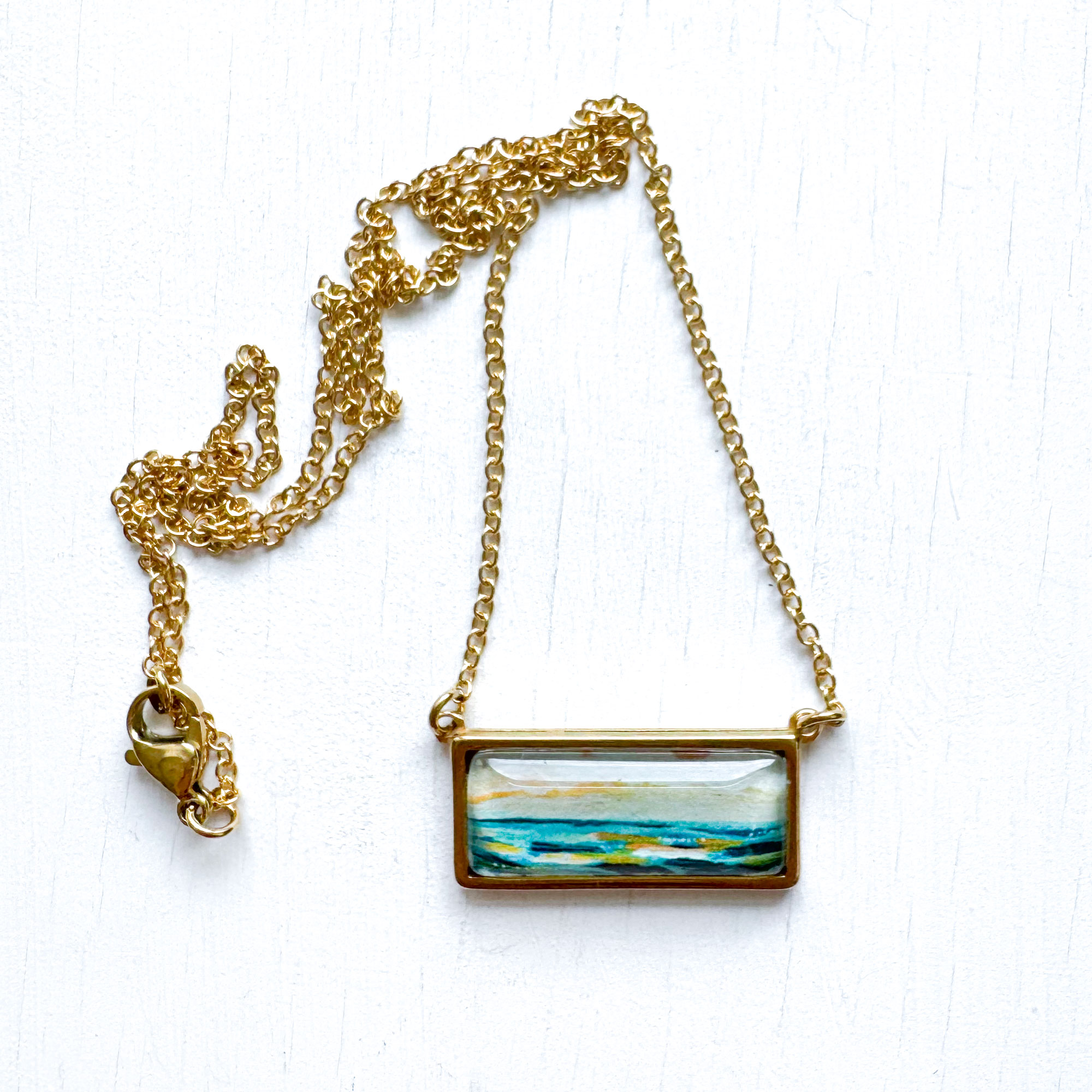 These trendy necklaces are made of stainless steel, the bar pendant measures approximately 1.11″ x 0.52″ and it features a tiny print of one of my originals paintings.