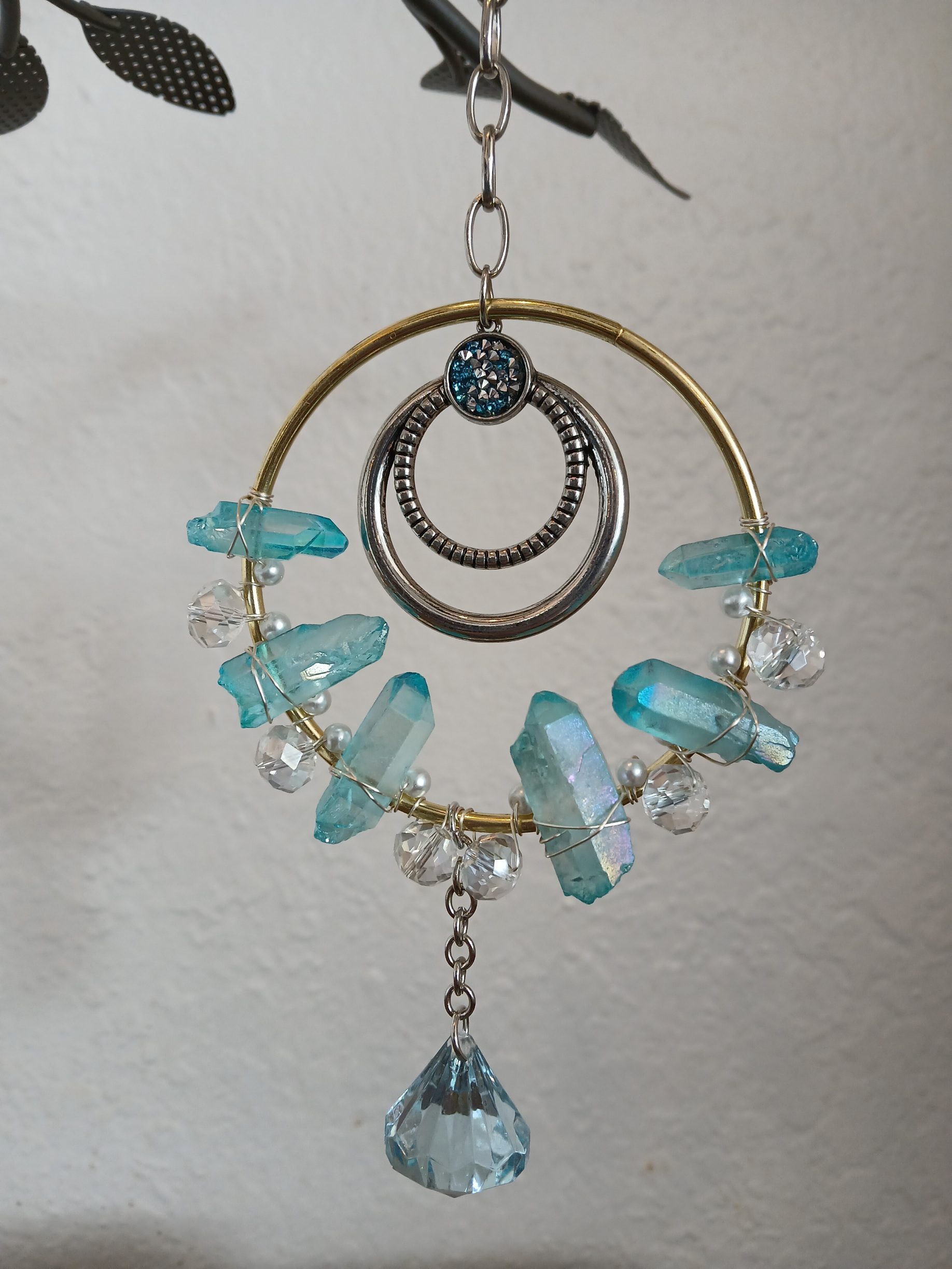 Handmade suncatcher on a 3″ gold tone ring. Created with a variety of objects including: glass beads and pearls, quartz crystal points, and repurposed jewelry pieces. This little trinket catches the light in a most beautiful way.