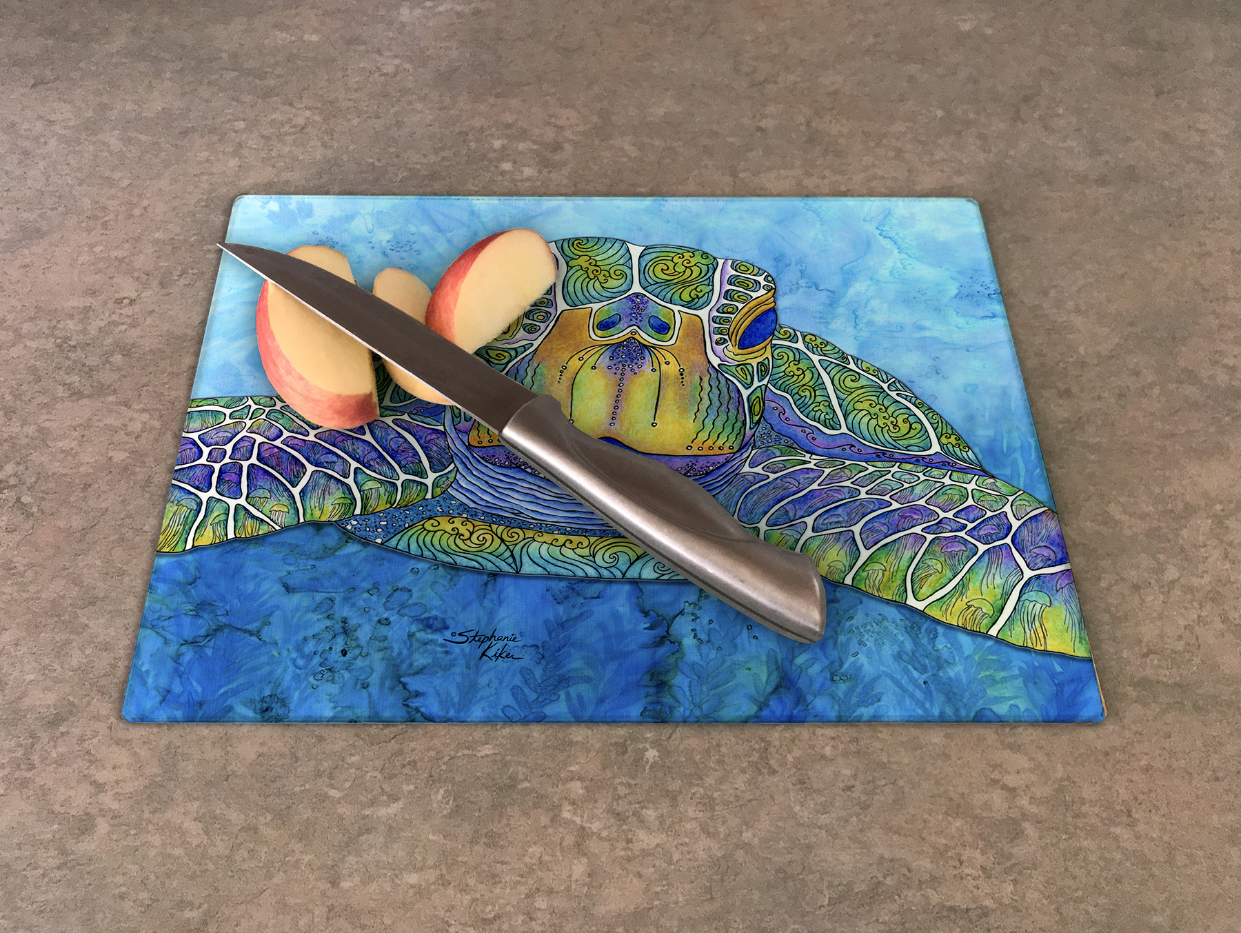 Made with tempered Glass, they can be used as Cutting Board, Hot Plate, Trivet or Cheese Board. Available in two sizes: 8” x 11” and 11” x 15.375”. Use for all of your everyday and gourmet cooking & serving needs. As a cutting surface, tempered glass resists stains, odors & and bacteria, and rubber feet prevent slipping on the counter-top. These boards make unique serving platters for hors d’oeuvres. Store in upright position to show off the board’s beauty. Artistic addition to any kitchen or wet bar area. Hand wash in warm water.
