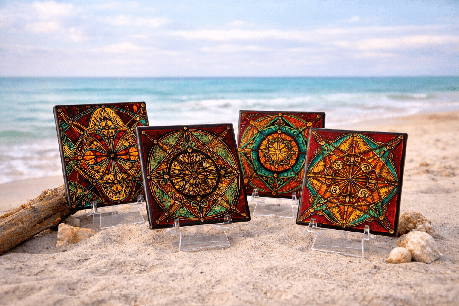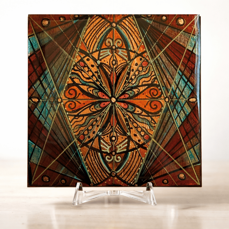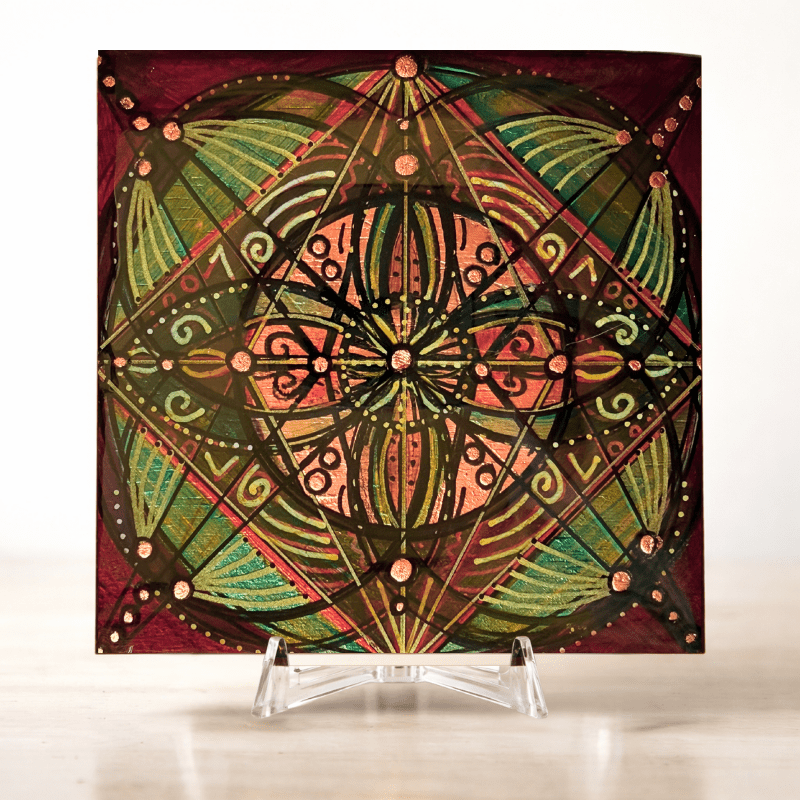 The Gilded Depths Emberlight Series is a small group of hand-painted mandala panels created through layered acrylic glazes, metallic pigments, and interference paints over a gilded gold and copper leaf backdrop. Each piece is built slowly through multiple layers, with gentle sanding between stages to allow depth and dimensional detail to emerge. A clear, light-enhancing seal completes the surface while preserving the painted work beneath.