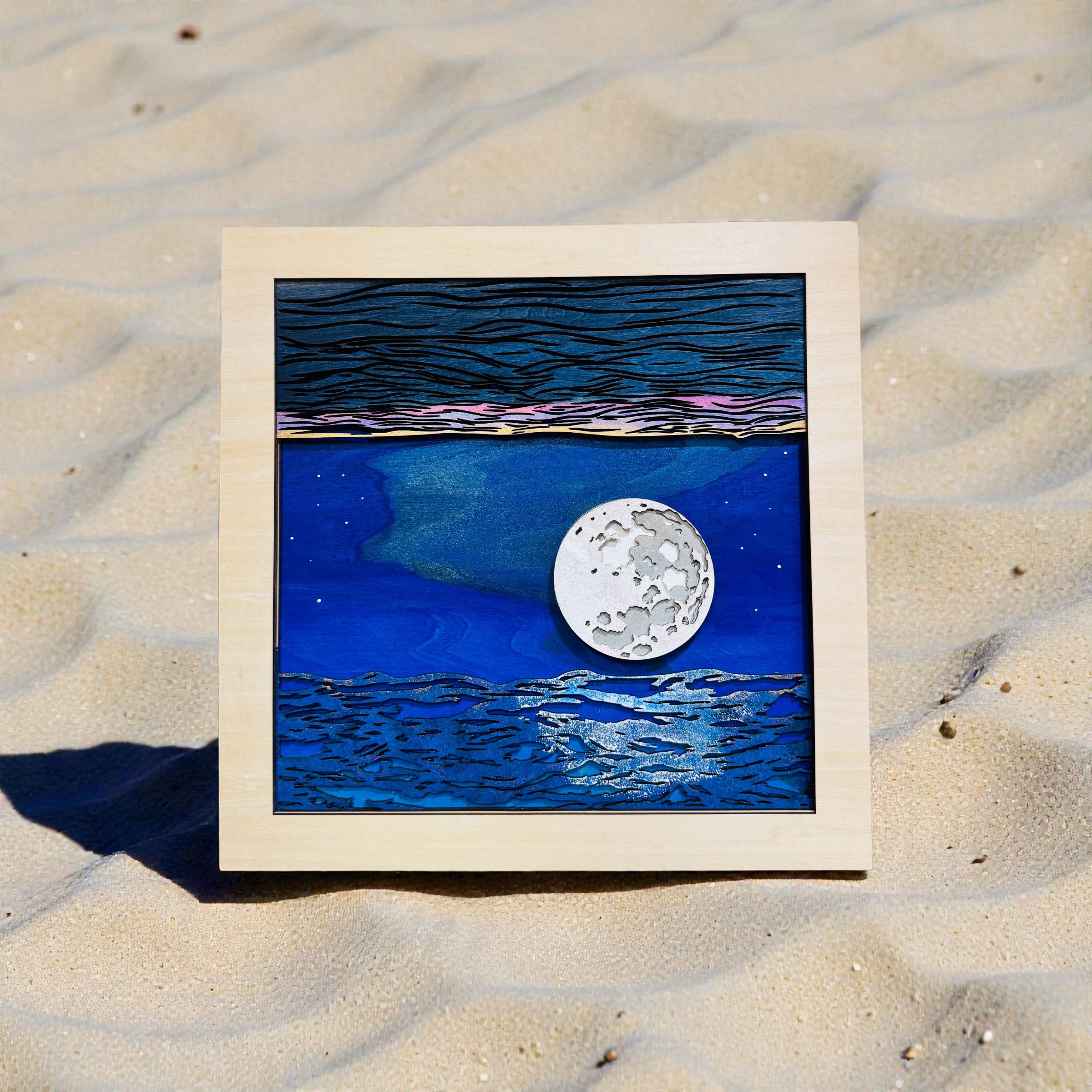 Low Moon on Night Beach ~ Wall Hanging 12″X12″ Original Design~ Laser Cut~ Hand Painted. Each pieces is made individually giving you a truly unique piece of art.