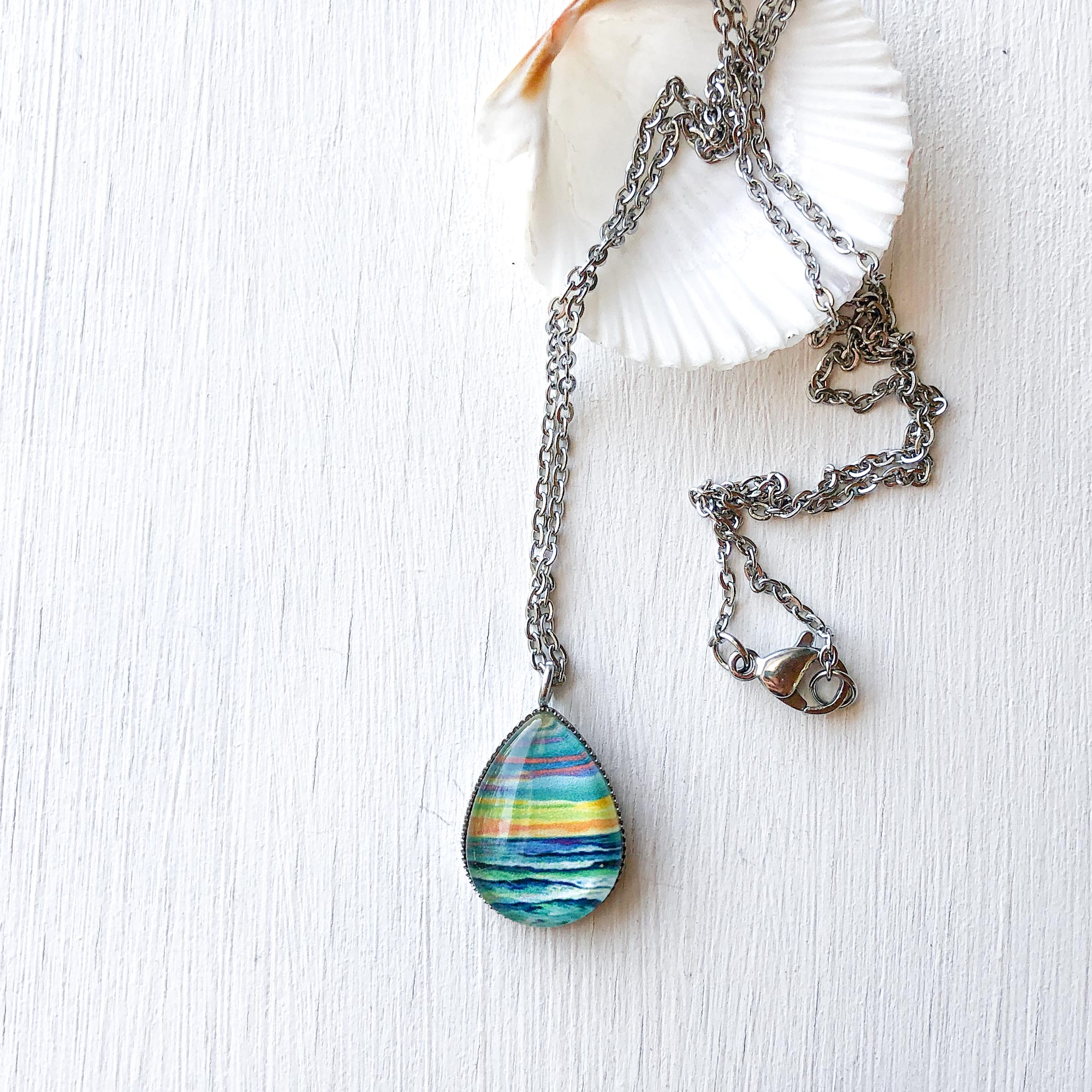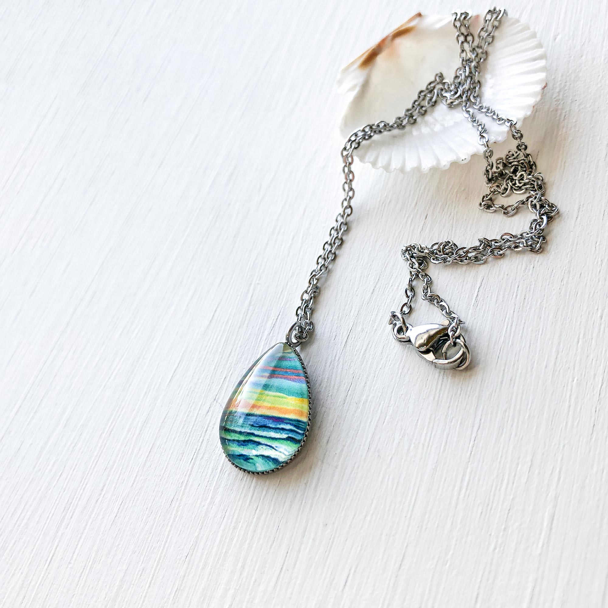 Rainbow Seascape– Stainless Steel Teardrop Necklace or Set Price range: $20.00 through $40.00