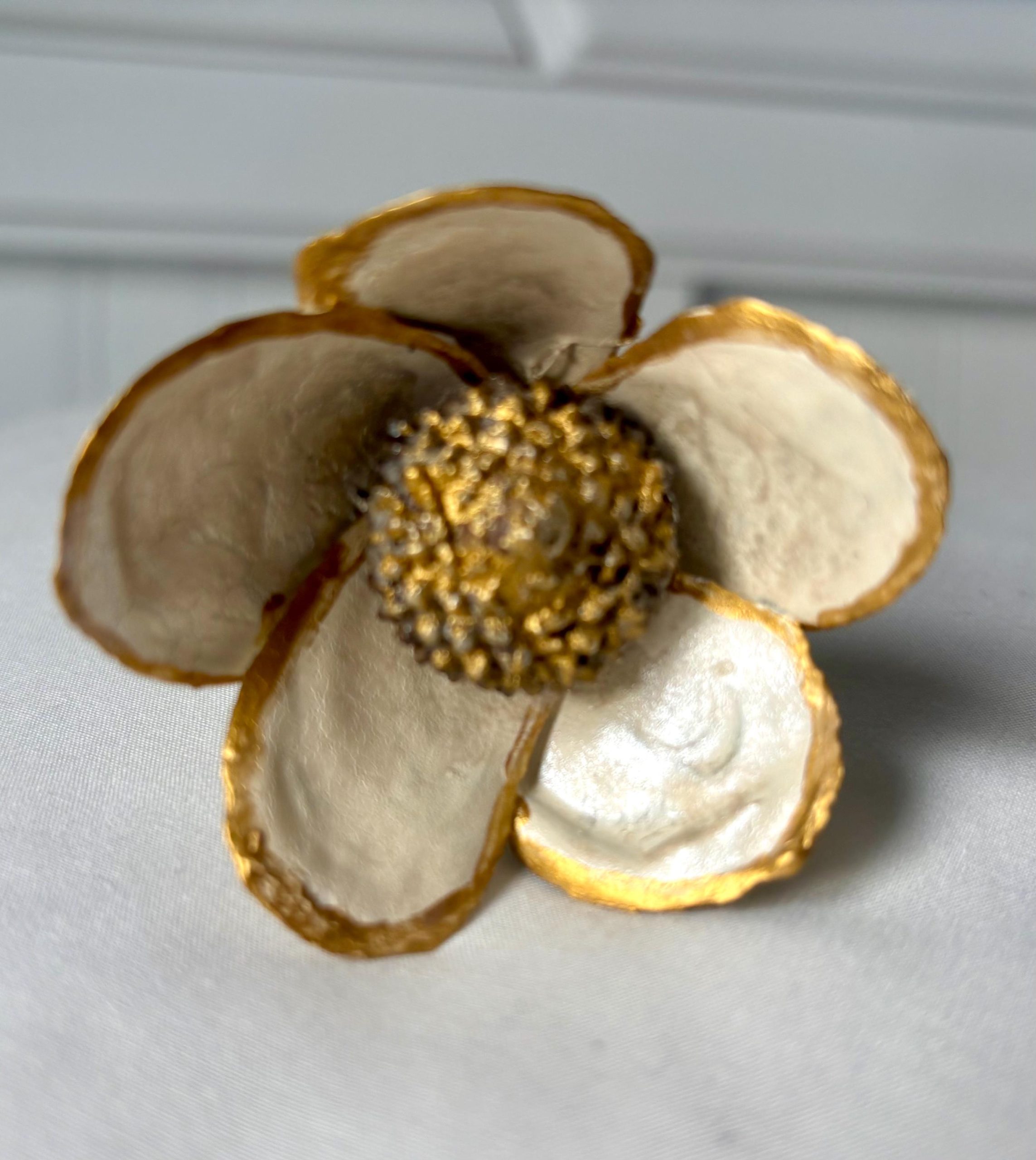 Crafted with meticulous attention to detail, this Oyster Shell Magnolia Wine Bottle Stopper is a true embodiment of coastal elegance. Each stopper features a unique design, with an acorn cap center surrounded by delicately repurposed oyster shells, exuding a touch of southern charm. The petals are adorned with gold leaf paint edging, adding a luxurious shimmer to this handmade seashell stopper. Whether for yourself or as a thoughtful coastal wine gift, this exquisite piece is a delightful addition to any wine enthusiast’s collection. Elevate your wine experience with this exquisite stopper that combines beauty and functionality effortlessly.