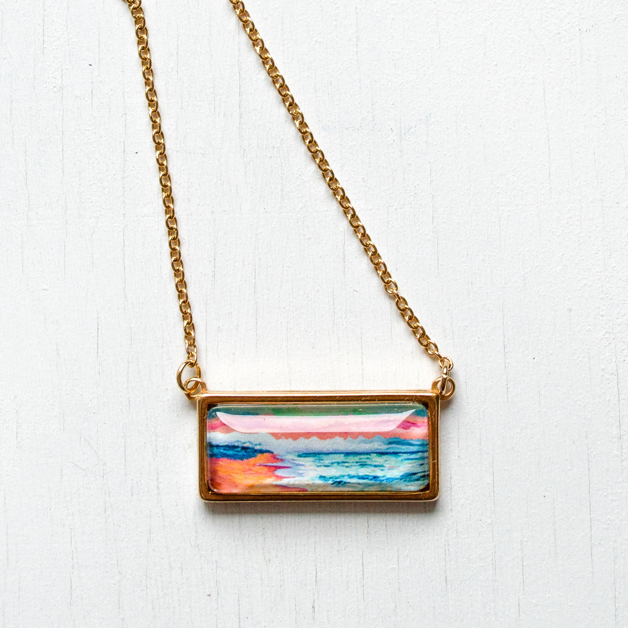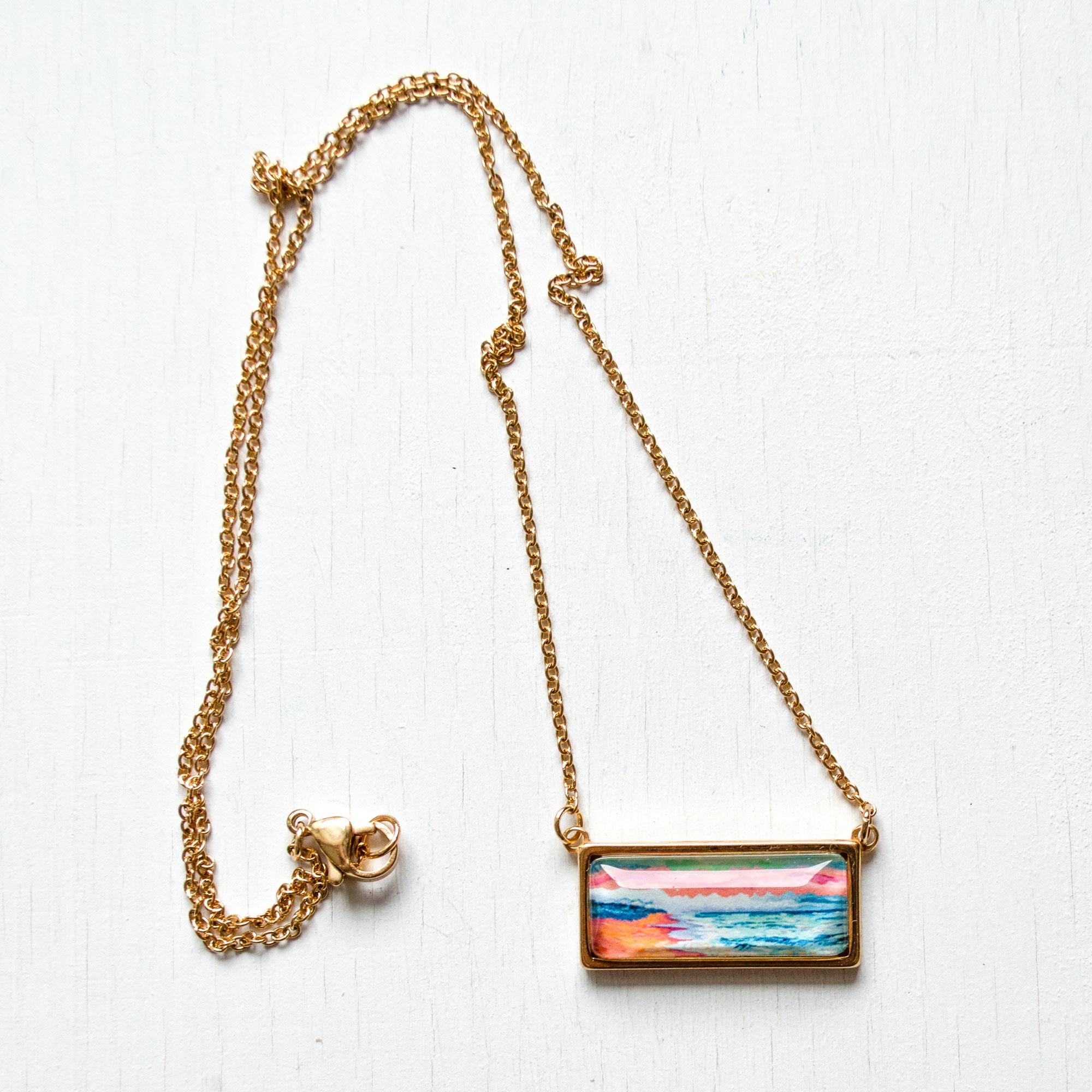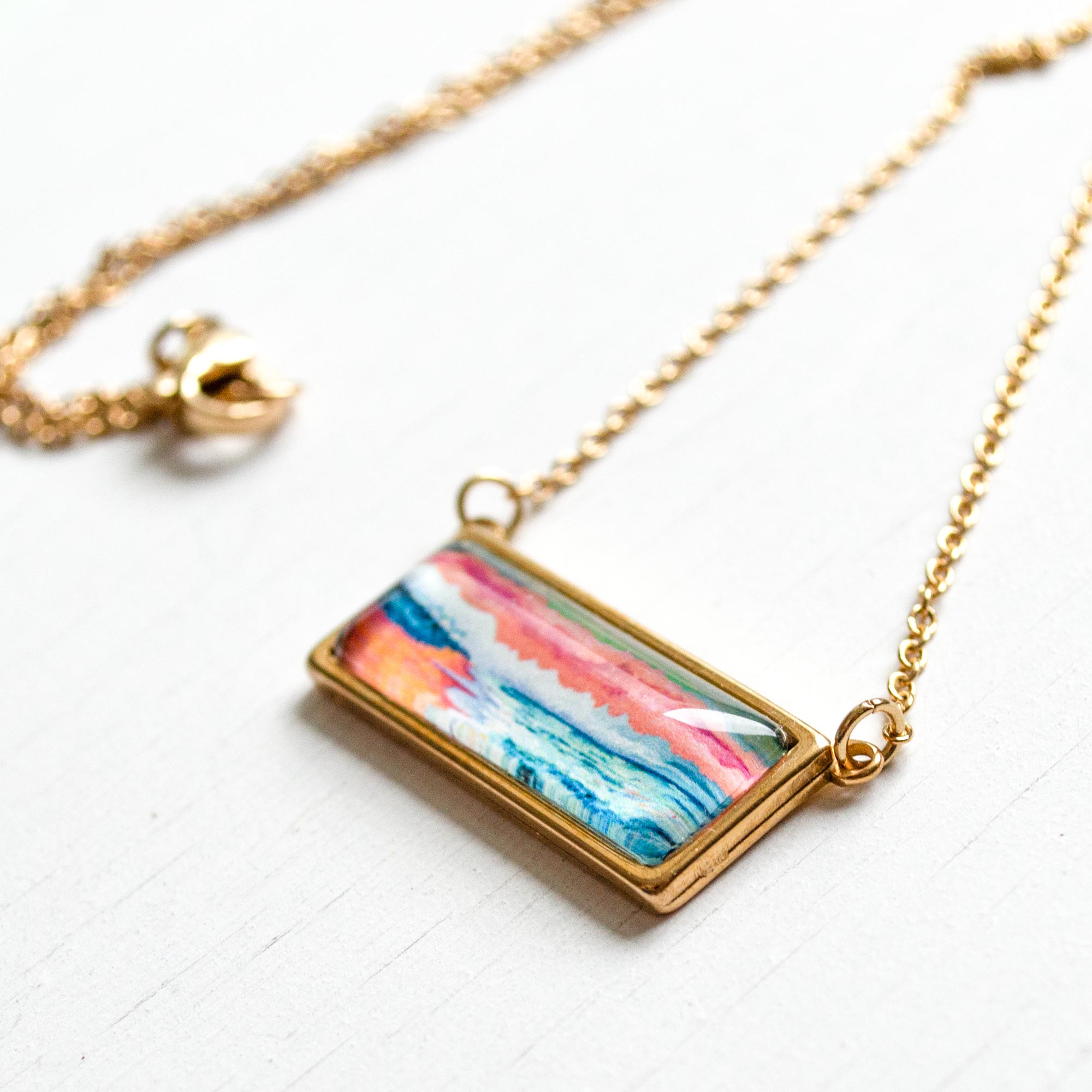 These trendy necklaces are made of stainless steel, the bar pendant measures approximately 1.11″ x 0.52″ and it features a tiny print of one of my originals paintings.