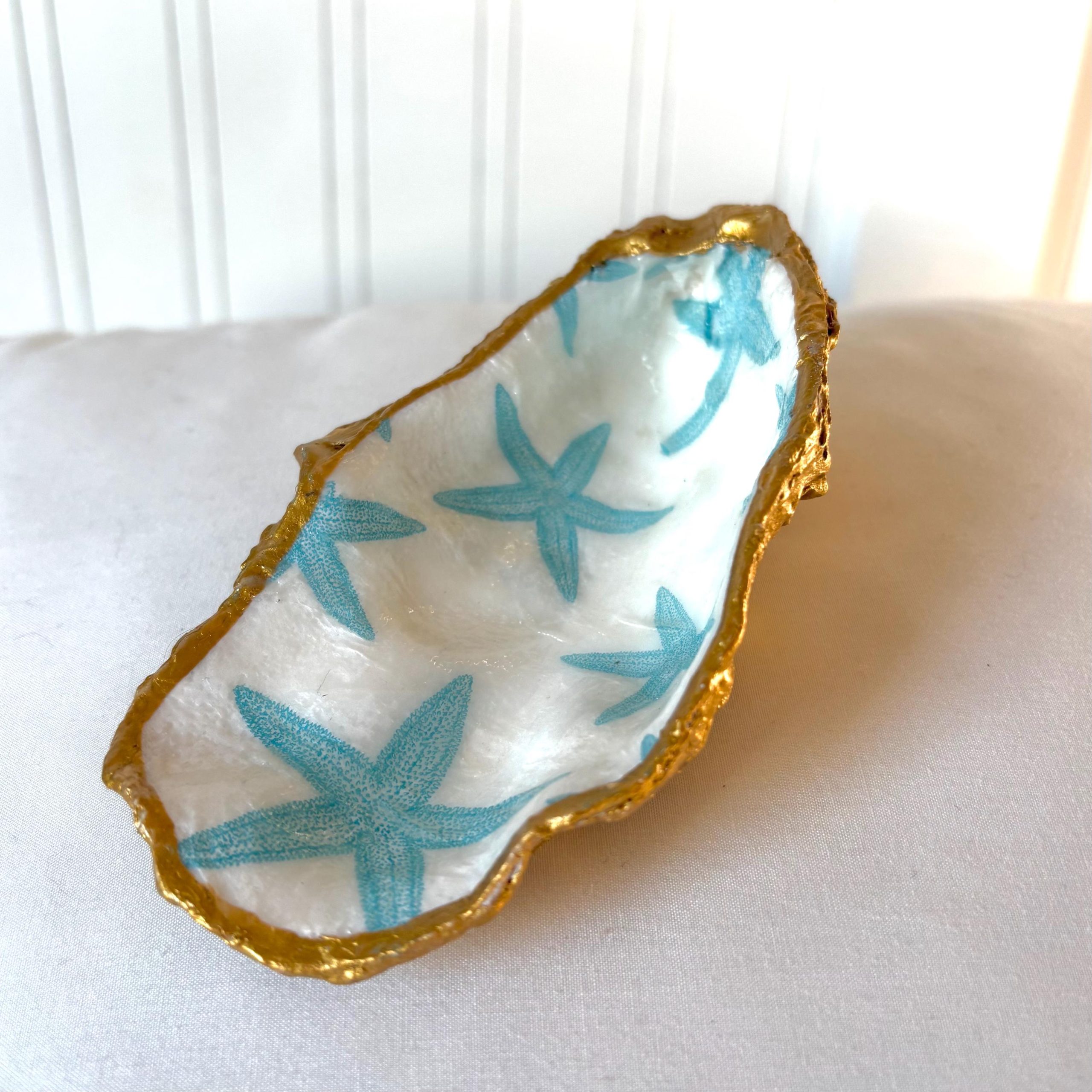 Immerse yourself in the essence of coastal charm with this handcrafted oyster elegantly sourced from North Carolina. Adorned with a nautical starfish print and delicately accented with golden leaf details, this exquisite piece serves as a delightful jewelry dish perfect for storing your rings and trinkets. Not just a functional decor piece, this unique oyster evokes a sense of seaside tranquility, bringing the calming ocean vibes to any space. Each oyster is distinct in shape and size, adding to its individual allure. Whether as a thoughtful hostess, wedding, or housewarming gift, or simply as a self-indulgent treat, this decoupaged oyster is a timeless treasure that resonates with anyone who cherishes the allure of the coast. Approximate size: 5.5″ x 3.5″ The back is gold.